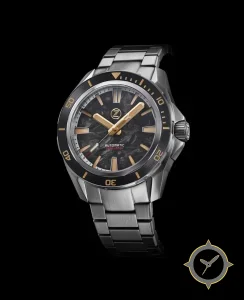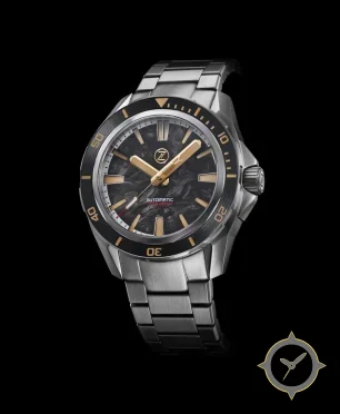 Eine Taucheruhr-Uhr mit einem markanten 41.5mm Auftritt am Handgelenk, gefertigt aus Edelstahl mit einem Zifferblatt in schwarz und einer besonderen "marbled / forged-carbon swirl"-Oberfläche.