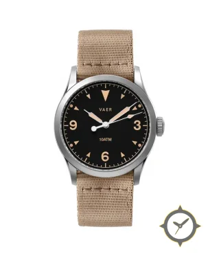 Eine Field-Uhr mit einem 31.5mm Gehäuse im Vintage-Stil gefertigt aus Edelstahl mit einem Zifferblatt in schwarz und einer besonderen "matte"-Oberfläche.