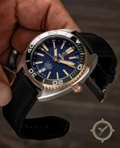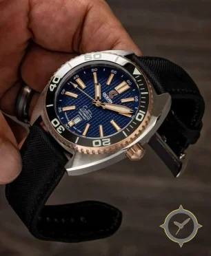 Eine Taucheruhr-Uhr mit einem markanten 42mm Auftritt am Handgelenk, gefertigt aus Edelstahl mit einem Zifferblatt in blau und einer besonderen "textured waffle (hobnail)"-Oberfläche.
