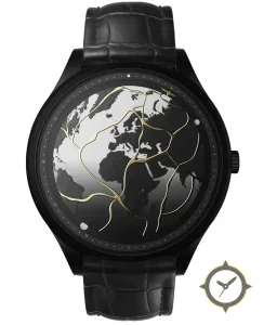 Eine Luxus-Uhr mit einem vielseitigen 38.5mm Gehäuse, das an fast jedes Handgelenk passt, gefertigt aus Edelstahl mit einem Zifferblatt in schwarz und einer besonderen "glossy dial with printed world map and decorative gold inlay"-Oberfläche.