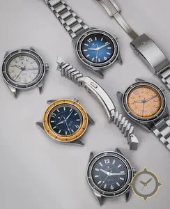 Eine Taucheruhr-Uhr mit einem 35.5mm Gehäuse im Vintage-Stil gefertigt aus Edelstahl mit einem Zifferblatt in blau und einer besonderen "sunburst/gradient"-Oberfläche.