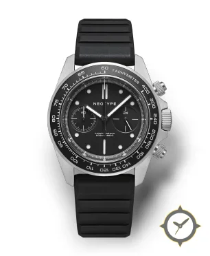 Eine Chronograph-Uhr mit einem markanten 43mm Auftritt am Handgelenk, gefertigt aus Edelstahl mit einem Zifferblatt in schwarz und einer besonderen "matte"-Oberfläche.