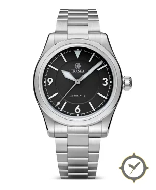 Eine Field-Uhr mit einem 34mm Gehäuse im Vintage-Stil gefertigt aus Edelstahl mit einem Zifferblatt in schwarz und einer besonderen "matte, two-step (raised outer chapter ring)"-Oberfläche.