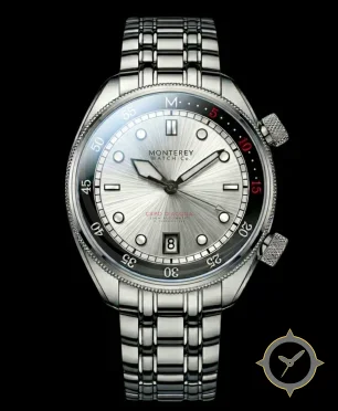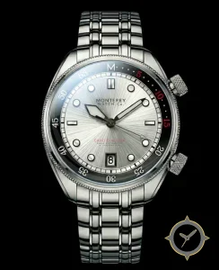 Eine Taucheruhr-Uhr mit einem markanten 42.5mm Auftritt am Handgelenk, gefertigt aus Edelstahl mit einem Zifferblatt in silber und einer besonderen "sunburst"-Oberfläche.
