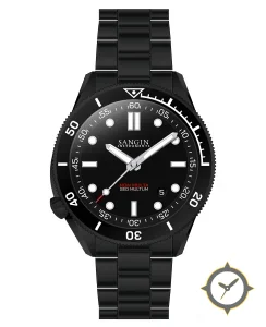 Eine Taucheruhr-Uhr mit einem 34mm Gehäuse im Vintage-Stil gefertigt aus Edelstahl mit einem Zifferblatt in schwarz und einer besonderen "matte"-Oberfläche.