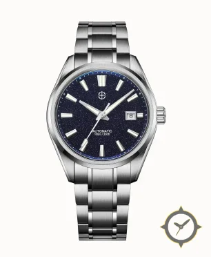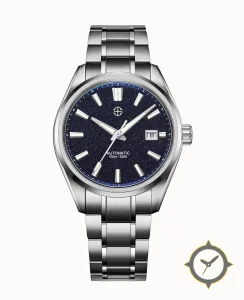 Eine Sport-Uhr mit einem markanten 44mm Auftritt am Handgelenk, gefertigt aus Edelstahl mit einem Zifferblatt in marineblau und einer besonderen "aventurine (sparkle)"-Oberfläche.