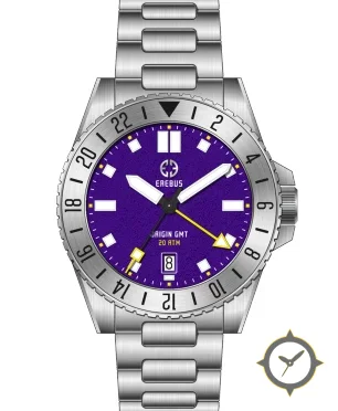 Eine GMT-Uhr mit einem markanten 45mm Auftritt am Handgelenk, gefertigt aus Edelstahl mit einem Zifferblatt in lila und einer besonderen "granular / textured"-Oberfläche und einer echten GMT-Funktion, mit der du eine zweite Zeitzone verfolgen kannst.