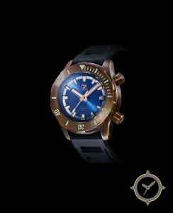 Eine Taucheruhr-Uhr mit einem markanten 49.5mm Auftritt am Handgelenk, gefertigt aus Bronze mit einem Zifferblatt in blau und einer besonderen "sunburst"-Oberfläche.