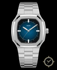 Eine Luxus-Uhr mit einem markanten 41.5mm Auftritt am Handgelenk, gefertigt aus Edelstahl mit einem Zifferblatt in blau und einer besonderen "sunburst"-Oberfläche.