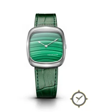 Eine Dress-Uhr mit einem vielseitigen 39.5mm Gehäuse, das an fast jedes Handgelenk passt, gefertigt aus Edelstahl mit einem Zifferblatt in grün und einer besonderen "malachite (stone)"-Oberfläche.