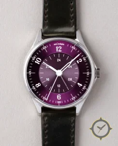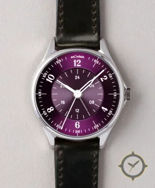Eine GMT-Uhr mit einem 34.5mm Gehäuse im Vintage-Stil gefertigt aus Edelstahl mit einem Zifferblatt in lila und einer besonderen "sunburst / concentric guilloché"-Oberfläche und einer echten GMT-Funktion, mit der du eine zweite Zeitzone verfolgen kannst.
