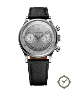 Eine Chronograph-Uhr mit einem markanten 45.5mm Auftritt am Handgelenk, gefertigt aus Edelstahl mit einem Zifferblatt in silber und einer besonderen "brushed sunburst"-Oberfläche.