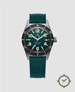 Eine Taucheruhr-Uhr mit einem markanten 43mm Auftritt am Handgelenk, gefertigt aus Edelstahl mit einem Zifferblatt in türkis und einer besonderen "sunburst"-Oberfläche.