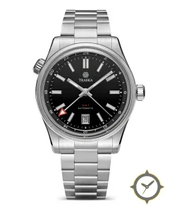 Eine GMT-Uhr mit einem 34.5mm Gehäuse im Vintage-Stil gefertigt aus Edelstahl mit einem Zifferblatt in schwarz und einer besonderen "matte"-Oberfläche und einer echten GMT-Funktion, mit der du eine zweite Zeitzone verfolgen kannst.