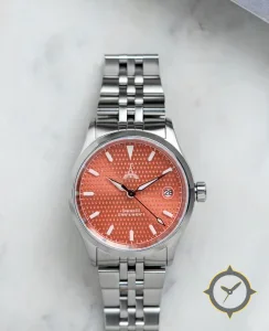 Eine Sport-Uhr mit einem 34.5mm Gehäuse im Vintage-Stil gefertigt aus Edelstahl mit einem Zifferblatt in orange und einer besonderen "hobnail guilloché"-Oberfläche.