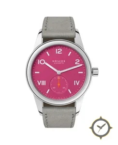 Eine Minimalistisch-Uhr mit einem markanten 41.5mm Auftritt am Handgelenk, gefertigt aus Edelstahl mit einem Zifferblatt in karmesinrot und einer besonderen "matte lacquer"-Oberfläche.