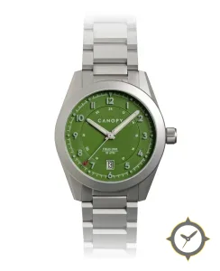 Eine Field-Uhr mit einem markanten 41.5mm Auftritt am Handgelenk, gefertigt aus Edelstahl mit einem Zifferblatt in grün und einer besonderen "matte, slightly grained texture"-Oberfläche.
