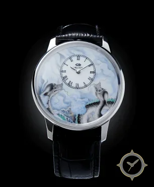 Eine Dress-Uhr mit einem markanten 50mm Auftritt am Handgelenk, gefertigt aus Edelstahl mit einem Zifferblatt in weiß und einer besonderen "enamel (hand-painted miniature)"-Oberfläche.