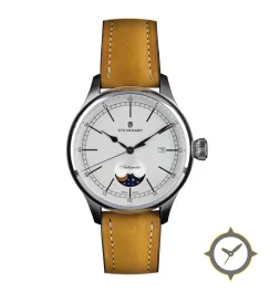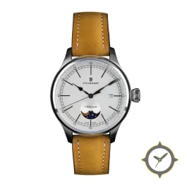 Eine Dress-Uhr mit einem markanten 49mm Auftritt am Handgelenk, gefertigt aus Edelstahl mit einem Zifferblatt in weiß und einer besonderen "lacquer (subtle sunburst/matte)"-Oberfläche und einer wunderschönen Mondphasenanzeige.