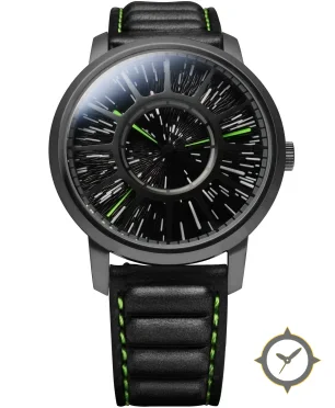 Eine Sport-Uhr mit einem 36mm Gehäuse im Vintage-Stil gefertigt aus Edelstahl mit einem Zifferblatt in schwarz und einer besonderen "radial textured burst with relief spokes and a recessed inner ring"-Oberfläche.
