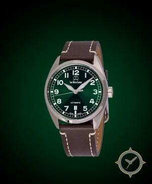 Eine Field-Uhr mit einem markanten 47.5mm Auftritt am Handgelenk, gefertigt aus Edelstahl mit einem Zifferblatt in grün und einer besonderen "sunburst"-Oberfläche.