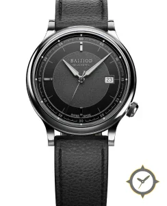 Eine Dress-Uhr mit einem 33.5mm Gehäuse im Vintage-Stil gefertigt aus Edelstahl mit einem Zifferblatt in schwarz und einer besonderen "textured matte central disk with smooth outer chapter ring"-Oberfläche.