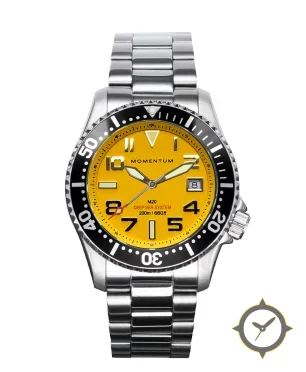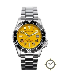 Eine Taucheruhr-Uhr mit einem markanten 48mm Auftritt am Handgelenk, gefertigt aus Edelstahl mit einem Zifferblatt in gelb und einer besonderen "matte"-Oberfläche.