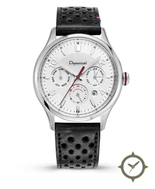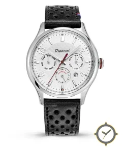 Eine Dress-Uhr mit einem 34mm Gehäuse im Vintage-Stil gefertigt aus Edelstahl mit einem Zifferblatt in weiß und einer besonderen "guilloche (engine-turned)"-Oberfläche.