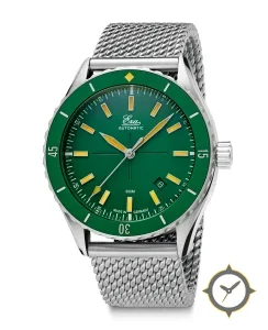 Eine Taucheruhr-Uhr mit einem markanten 47.5mm Auftritt am Handgelenk, gefertigt aus Edelstahl mit einem Zifferblatt in grün und einer besonderen "sunburst"-Oberfläche.