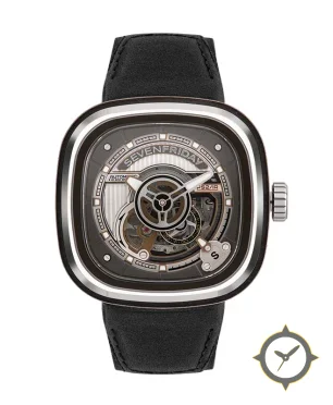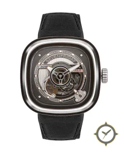 Eine Skelett-Uhr mit einem markanten 44mm Auftritt am Handgelenk, gefertigt aus Edelstahl mit einem Zifferblatt in schwarz und einer besonderen "skeletonized / open-work with visible movement components and vertical brushing"-Oberfläche.