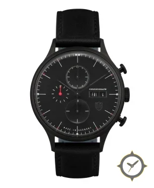 Eine Chronograph-Uhr mit einem 36mm Gehäuse im Vintage-Stil gefertigt aus Edelstahl mit einem Zifferblatt in schwarz und einer besonderen "matte"-Oberfläche.