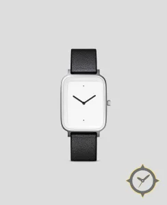 Eine Minimalistisch-Uhr mit einem vielseitigen 40.5mm Gehäuse, das an fast jedes Handgelenk passt, gefertigt aus Edelstahl mit einem Zifferblatt in weiß und einer besonderen "matte"-Oberfläche.