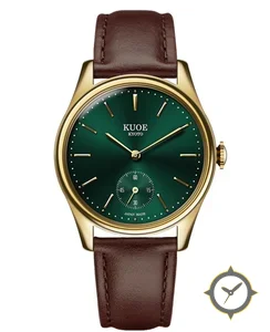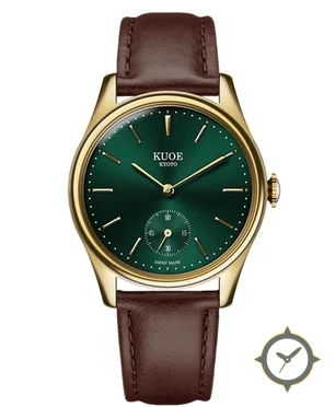 Eine Dress-Uhr mit einem 29mm Gehäuse im Vintage-Stil gefertigt aus Gold mit einem Zifferblatt in grün und einer besonderen "sunburst"-Oberfläche.