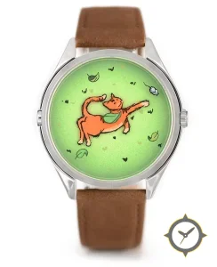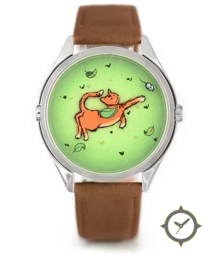 Eine Minimalistisch-Uhr mit einem markanten 42mm Auftritt am Handgelenk, gefertigt aus Edelstahl mit einem Zifferblatt in grün und einer besonderen "matte illustrated surface"-Oberfläche.