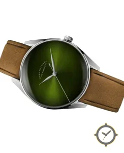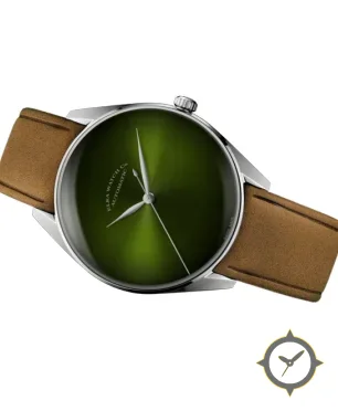 Eine Minimalistisch-Uhr mit einem 35mm Gehäuse im Vintage-Stil gefertigt aus Edelstahl mit einem Zifferblatt in grün und einer besonderen "sunburst gradient"-Oberfläche.