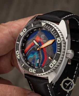 Eine Taucheruhr-Uhr mit einem markanten 47mm Auftritt am Handgelenk, gefertigt aus Edelstahl mit einem Zifferblatt in blau und einer besonderen "textured, layered/agate/topographic finish"-Oberfläche.