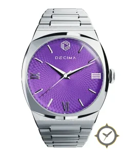 Eine Luxus-Uhr mit einem 31mm Gehäuse im Vintage-Stil gefertigt aus Edelstahl mit einem Zifferblatt in lila und einer besonderen "guilloché (radial)"-Oberfläche.