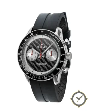 Eine Chronograph-Uhr mit einem markanten 50mm Auftritt am Handgelenk, gefertigt aus Edelstahl mit einem Zifferblatt in schwarz und einer besonderen "carbon-fiber"-Oberfläche.