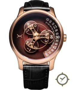 Eine Luxus-Uhr mit einem 36mm Gehäuse im Vintage-Stil gefertigt aus Gold mit einem Zifferblatt in braun und einer besonderen "guilloche (concentric sunburst)"-Oberfläche.