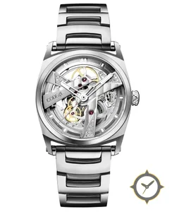 Eine Skelett-Uhr mit einem vielseitigen 40.5mm Gehäuse, das an fast jedes Handgelenk passt, gefertigt aus Edelstahl mit einem Zifferblatt in silber und einer besonderen "open-worked / skeletonized"-Oberfläche.