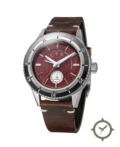 Eine Taucheruhr-Uhr mit einem 34.5mm Gehäuse im Vintage-Stil gefertigt aus Edelstahl mit einem Zifferblatt in rot und einer besonderen "guilloché wave texture (seigaiha-style)"-Oberfläche und einer praktischen Gangreserveanzeige.