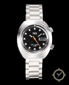 Eine Taucheruhr-Uhr mit einem markanten 42.5mm Auftritt am Handgelenk, gefertigt aus Edelstahl mit einem Zifferblatt in schwarz und einer besonderen "matte"-Oberfläche.
