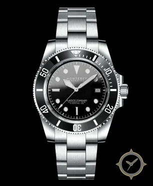 Eine Taucheruhr-Uhr mit einem vielseitigen 38.5mm Gehäuse, das an fast jedes Handgelenk passt, gefertigt aus Edelstahl mit einem Zifferblatt in schwarz und einer besonderen "glossy lacquer finish"-Oberfläche.