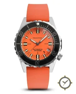 Eine Taucheruhr-Uhr mit einem 36.5mm Gehäuse im Vintage-Stil gefertigt aus Edelstahl mit einem Zifferblatt in orange und einer besonderen "matte"-Oberfläche.