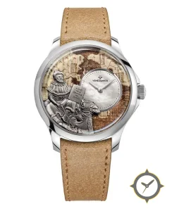Eine Luxus-Uhr mit einem markanten 43mm Auftritt am Handgelenk, gefertigt aus Edelstahl mit einem Zifferblatt in braun und einer besonderen "engraved/sculpted relief over a printed antique-map background"-Oberfläche.