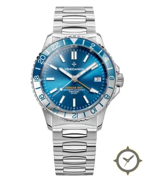 Eine GMT-Uhr mit einem vielseitigen 38.5mm Gehäuse, das an fast jedes Handgelenk passt, gefertigt aus Edelstahl mit einem Zifferblatt in blau und einer besonderen "sunburst"-Oberfläche und einer echten GMT-Funktion, mit der du eine zweite Zeitzone verfolgen kannst.