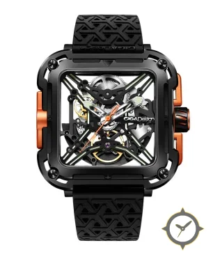 Eine Skelett-Uhr gefertigt aus Edelstahl mit einem Zifferblatt in schwarz und einer besonderen "skeleton / open-worked, exposed movement"-Oberfläche.