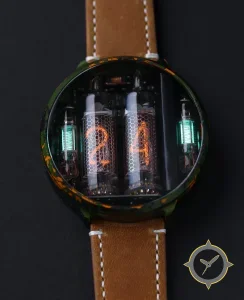 Eine Vintage-Uhr mit einem markanten 64mm Auftritt am Handgelenk, gefertigt aus Beschichtung mit einem Zifferblatt in schwarz und einer besonderen "exposed components / glass dome"-Oberfläche.