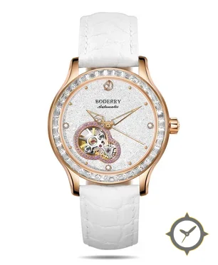 Eine Skelett-Uhr mit einem 36mm Gehäuse im Vintage-Stil gefertigt aus Gold mit einem Zifferblatt in marineblau und einer besonderen "sparkling aventurine / glitter"-Oberfläche.