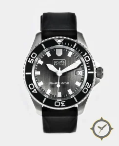 Eine Taucheruhr-Uhr mit einem 36mm Gehäuse im Vintage-Stil gefertigt aus Edelstahl mit einem Zifferblatt in schwarz und einer besonderen "brushed"-Oberfläche.